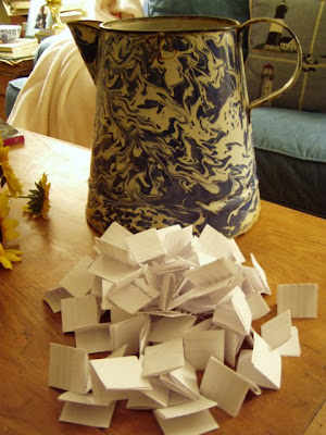 Then it was time to go on a little scavenger hunt through the house to find a container that would hold 80+ folded pieces of paper. This enamel ware pitcher in the bonus room looked like it would work just fine.