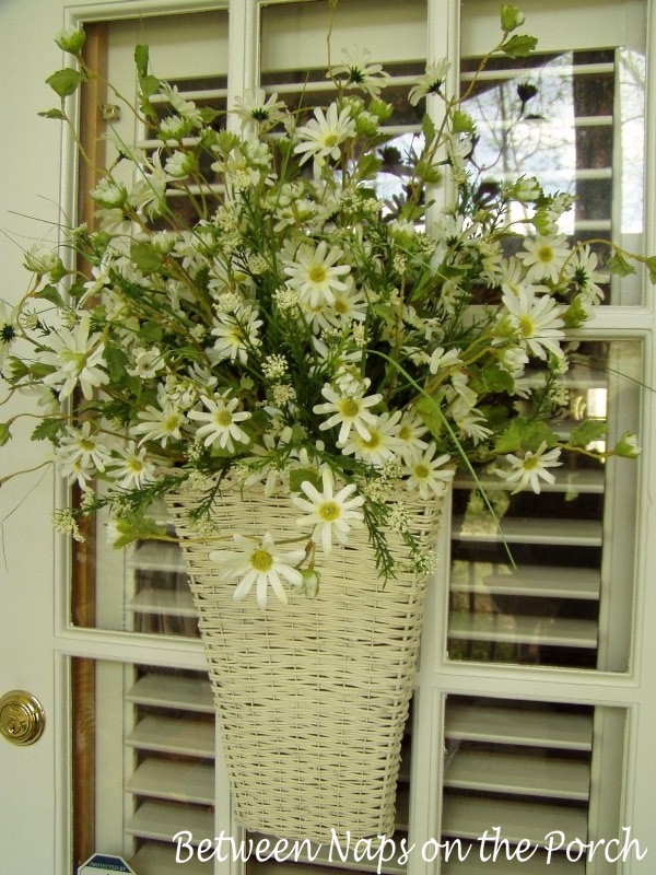 There are screened doors on either end of the porch, each leading onto a deck. This is a view standing at one of those doors looking across the room. I covered the porch swing chains with covers designed to cover electrical cords from Hobby Lobby..so much better than seeing the raw chain.