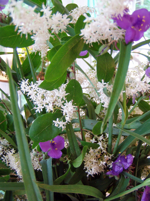 The spiderwort has long skinny leaves that just shoot out from the stem...kind of like the legs of a spider....wonder if that's where it got it's name? It gave the arrangement a wild and wooly look. :-)